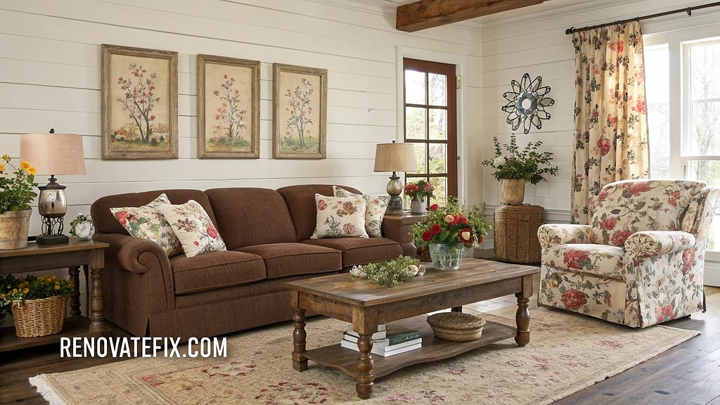 Floral chintz chairs flank brown fabric sofa while vintage botanical prints line walls.