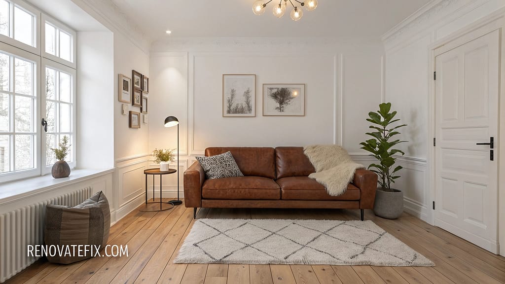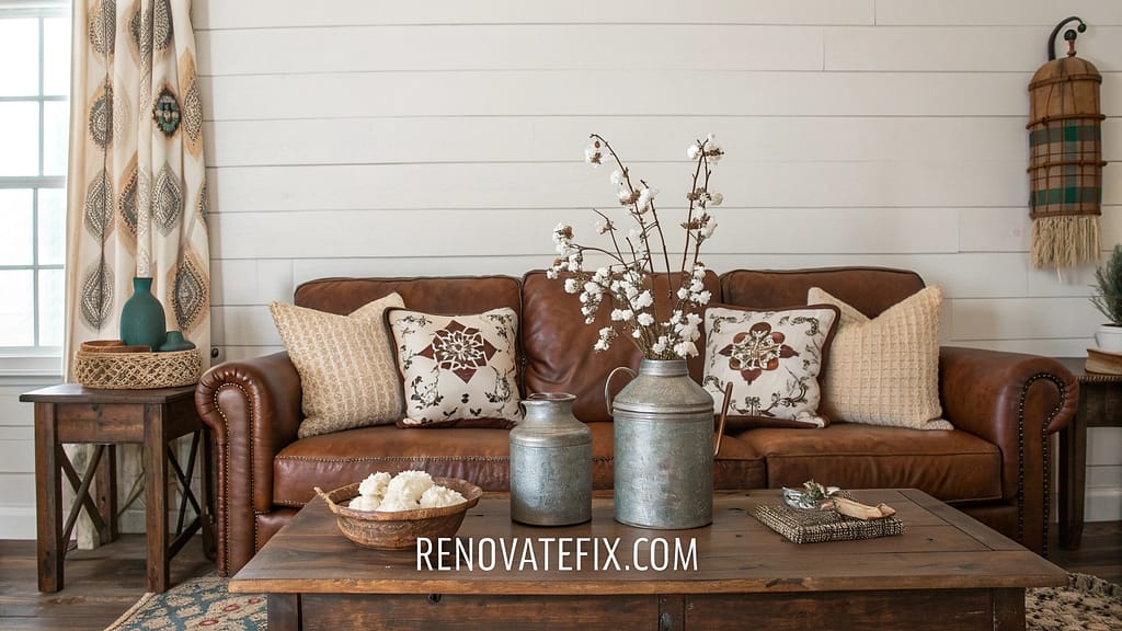 A cream-colored shag rug anchored beneath your brown leather sofa creates depth through textural contrast, while ivory throw pillows and a woven jute ottoman build layers of warmth.