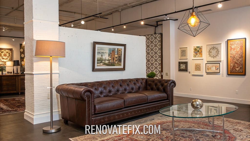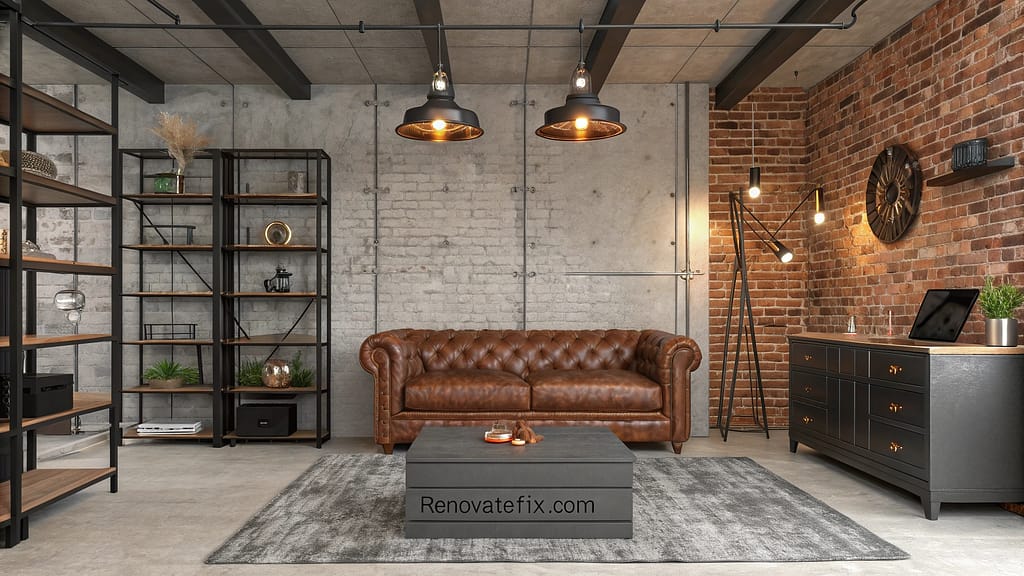 Raw brick walls frame your brown leather sofa, while metallic pendant lights hang from exposed ceiling beams.