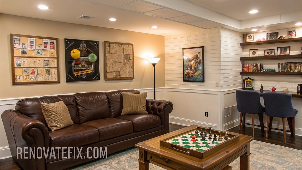 Chess table pairs with brown leather couch while vintage board games decorate walls.