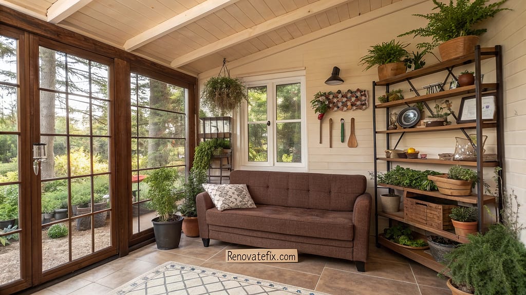 Greenhouse windows surround brown fabric sofa while potted herbs line windowsills.