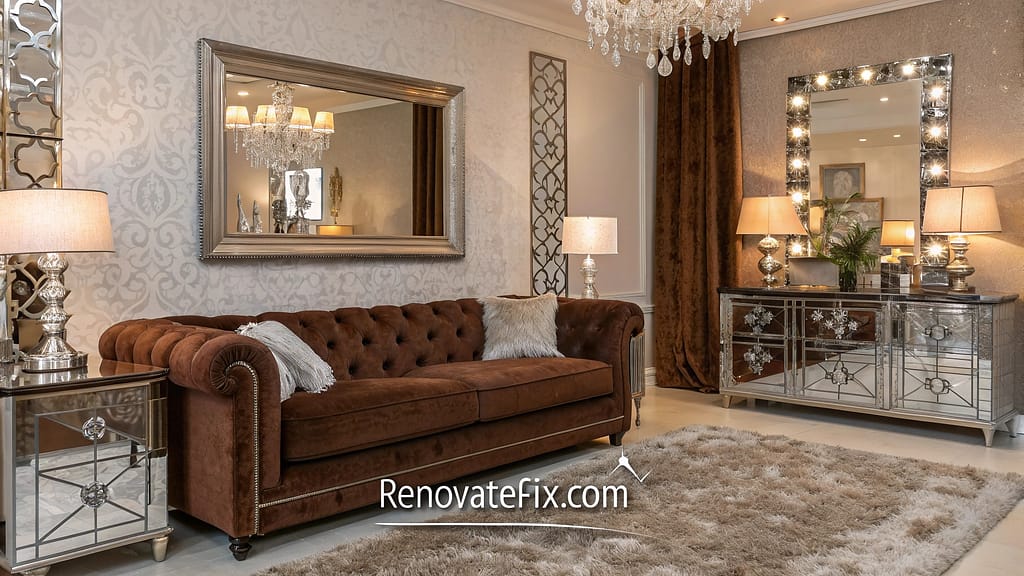 Mirrored console table reflects brown velvet sofa while crystal table lamps add sparkle.