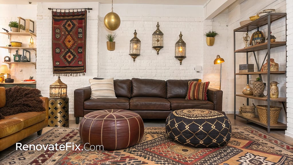 Moroccan leather poufs accompany brown couch while kilim pillows add color.