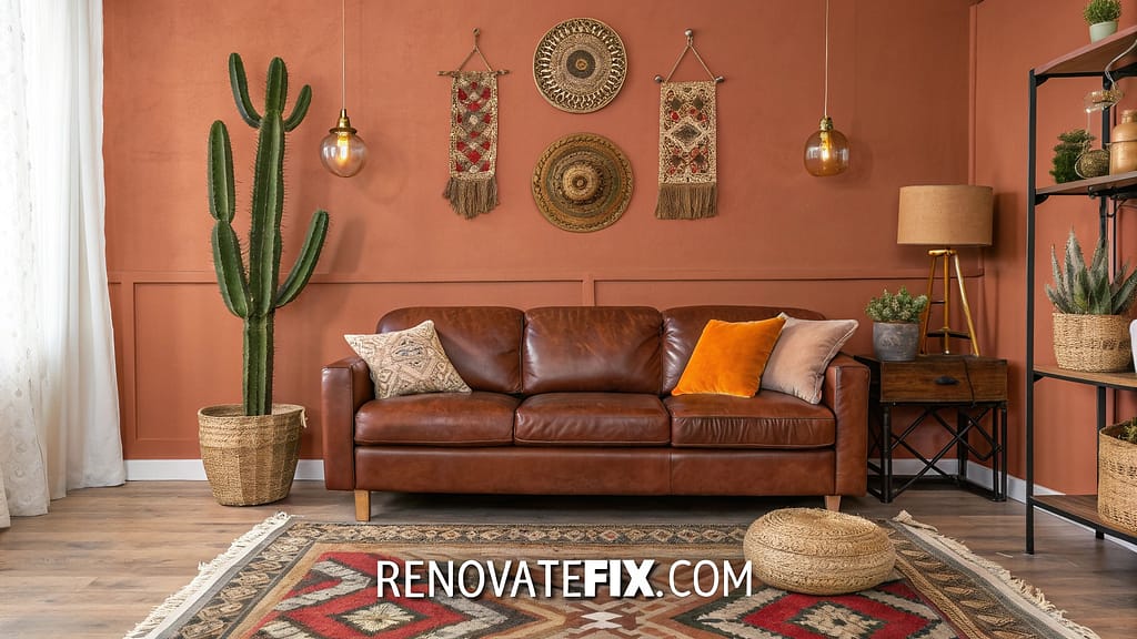 Terra cotta walls surround your brown leather couch, accented by sunset orange throw pillows and southwestern pattern rugs.