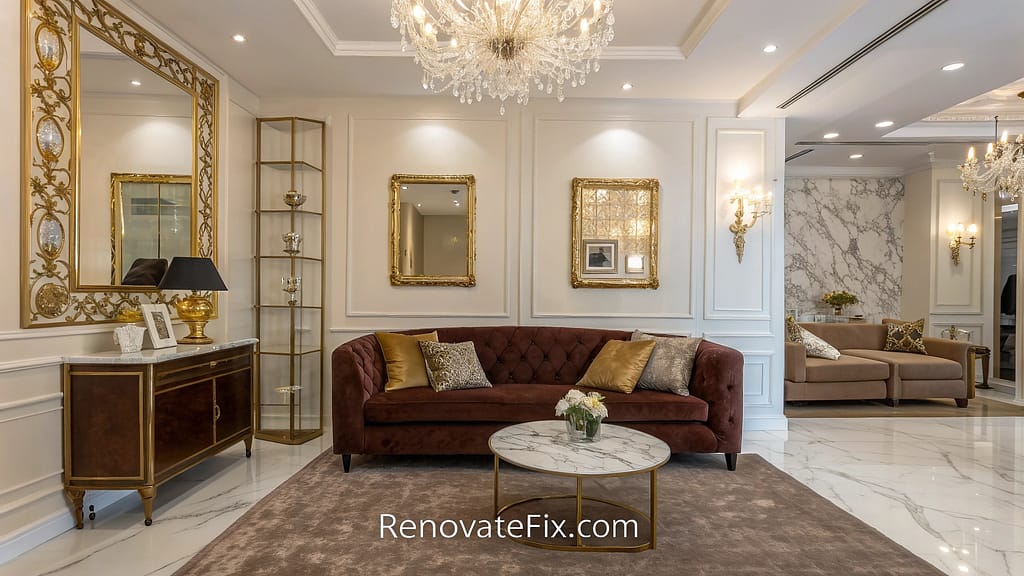 Rich brown velvet sofa anchors room filled with gold mirror frames and crystal chandeliers.