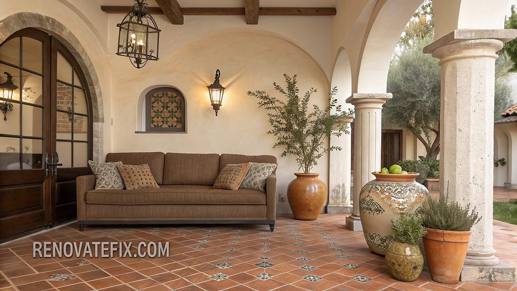 Arched doorways frame brown fabric sofa while terracotta tiles ground space.