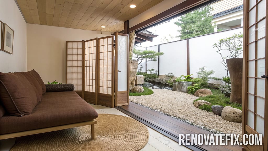 Rice paper screens filter light while stone garden creates peaceful focal point.