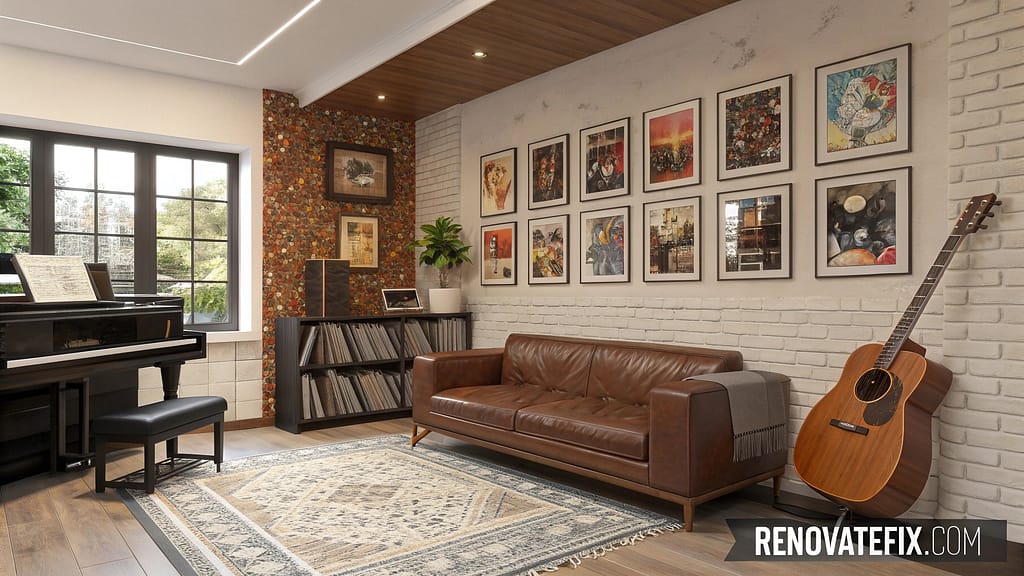Piano stands near brown leather couch while guitar display decorates wall.