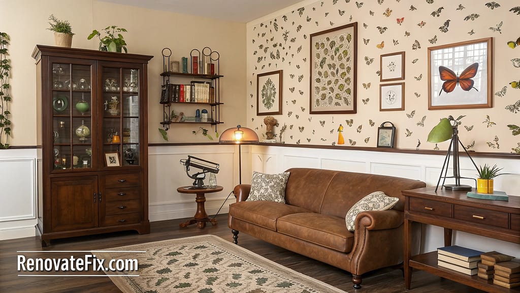 Butterfly collection displays near brown sofa while microscope serves as conversation piece.