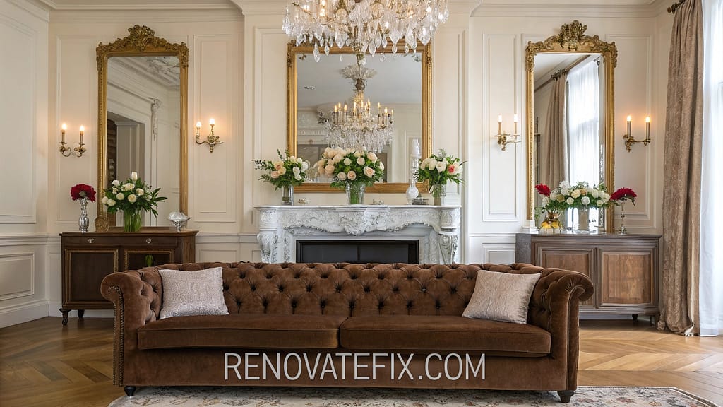 Crystal chandelier illuminates brown velvet sofa while gilt mirrors reflect light.