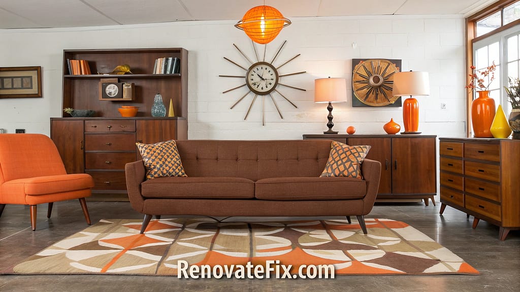 Mid-century brown sofa pairs with sunburst clock and starburst mirror.