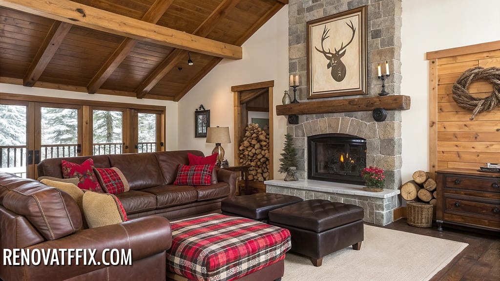 Stone fireplace serves as focal point behind brown sofa, accompanied by plaid wool throws and leather ottomans.