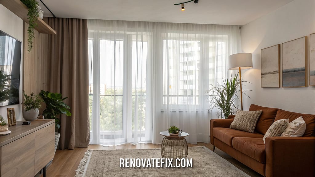 Natural light streaming through sheer white curtains brightens up space, making brown furniture appear lighter and more inviting against pale walls.