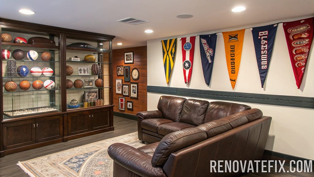 Ball collection displays on floating shelves as leather recliners provide additional seating.