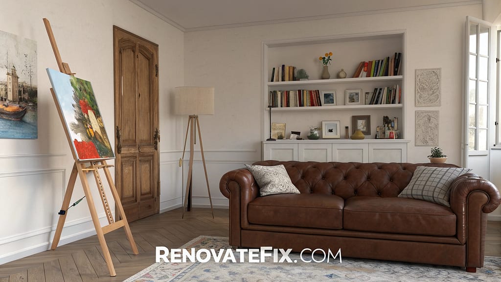 Easel stands near brown leather couch while paint brushes fill ceramic containers.