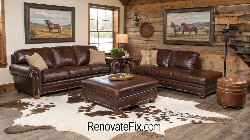 Cowhide rug lies beneath brown leather couch while ranch photography decorates walls.