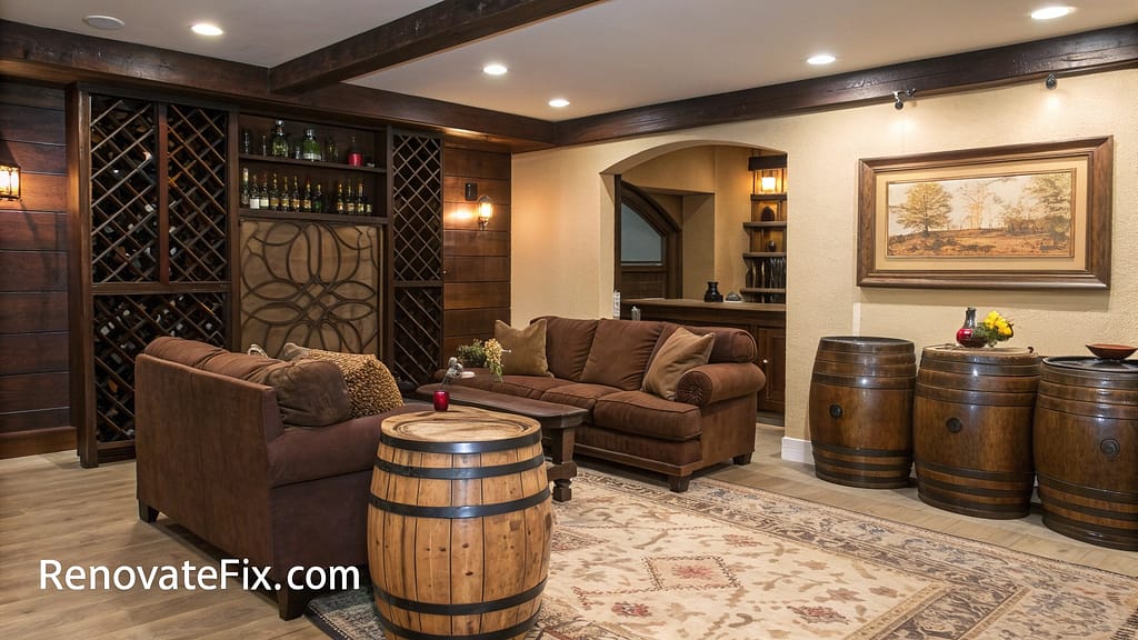 Wine barrel side tables flank brown sofa while cork collection creates wall art.