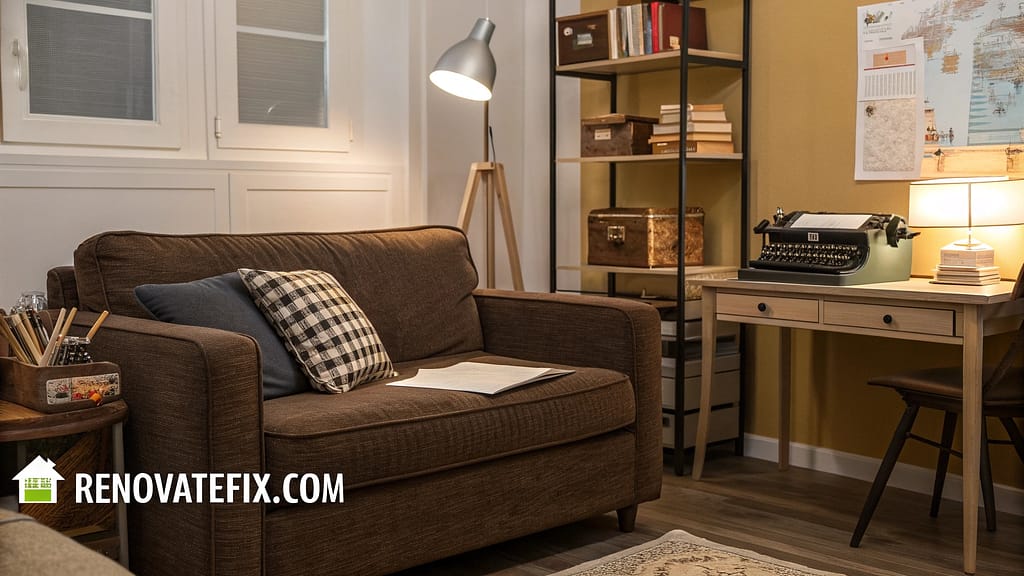 Writing desk pairs with brown fabric sofa while typewriter collection decorates shelves.