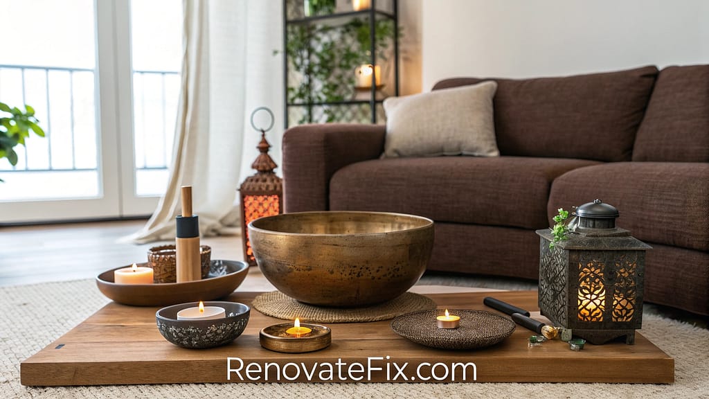 Singing bowls display on floating shelf as bamboo blinds filter light.