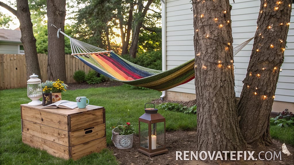 Establish relaxation zone between trees or posts using affordable hammock with nearby milk crate side table.