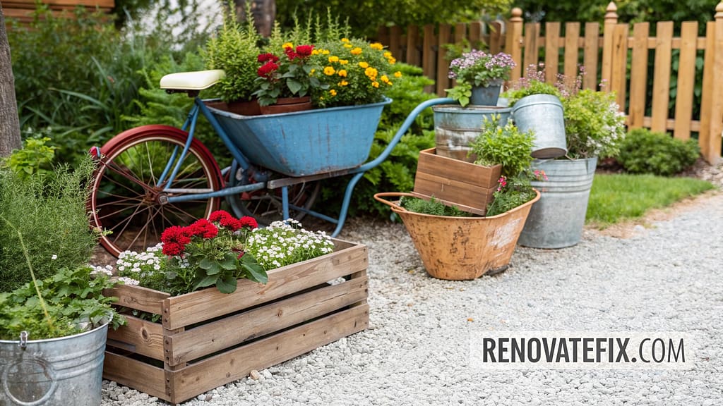 Convert old wheelbarrows, boots, buckets, bathtubs, or wooden crates into unique growing containers after adding drainage holes.