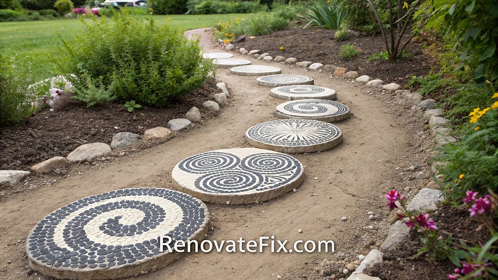 Craft artistic pathway elements by arranging smooth river stones into patterns within concrete forms.