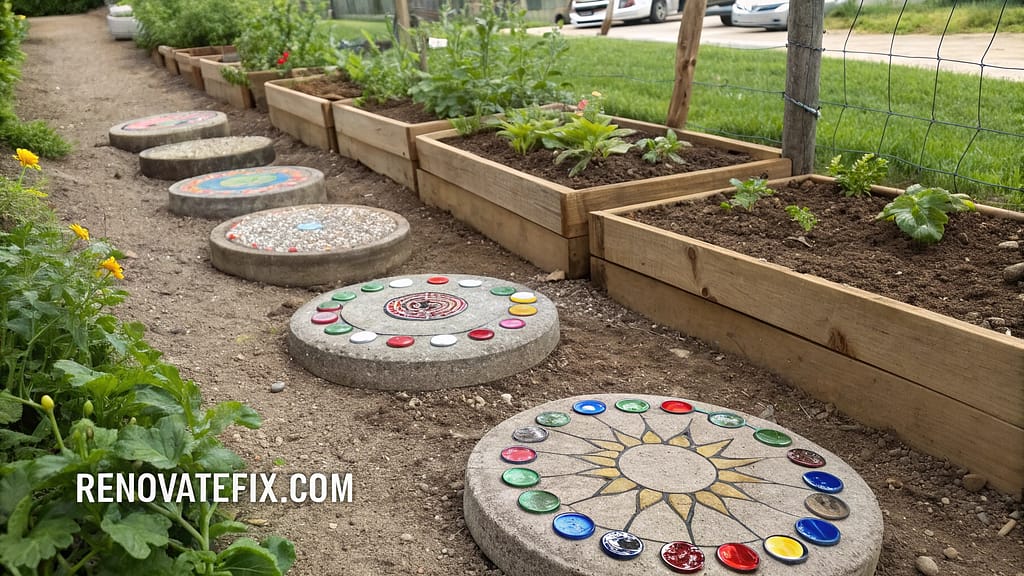Craft distinctive pathway elements by embedding collected bottle caps into concrete poured into molds.