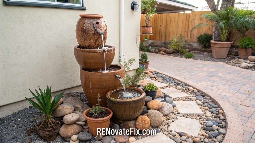 Stack weathered pots, arrange smooth river stones, or convert unused fountains into bubbling features that provide soothing sounds.