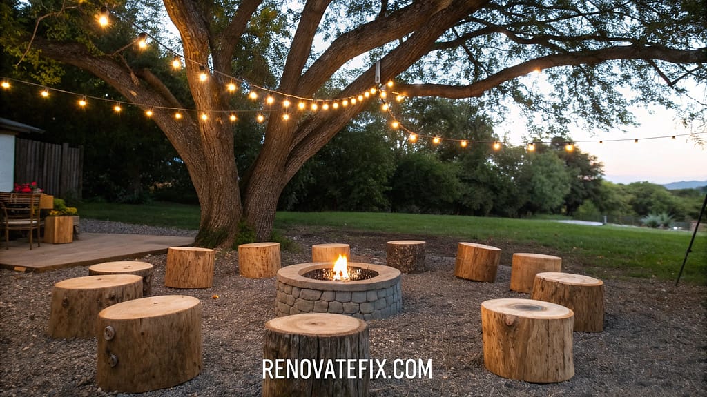 Arrange sections of fallen trees into conversation circle around fire pit or central space. Sand top surfaces smooth, apply clear weatherproof sealer, and position at comfortable heights for adults.
