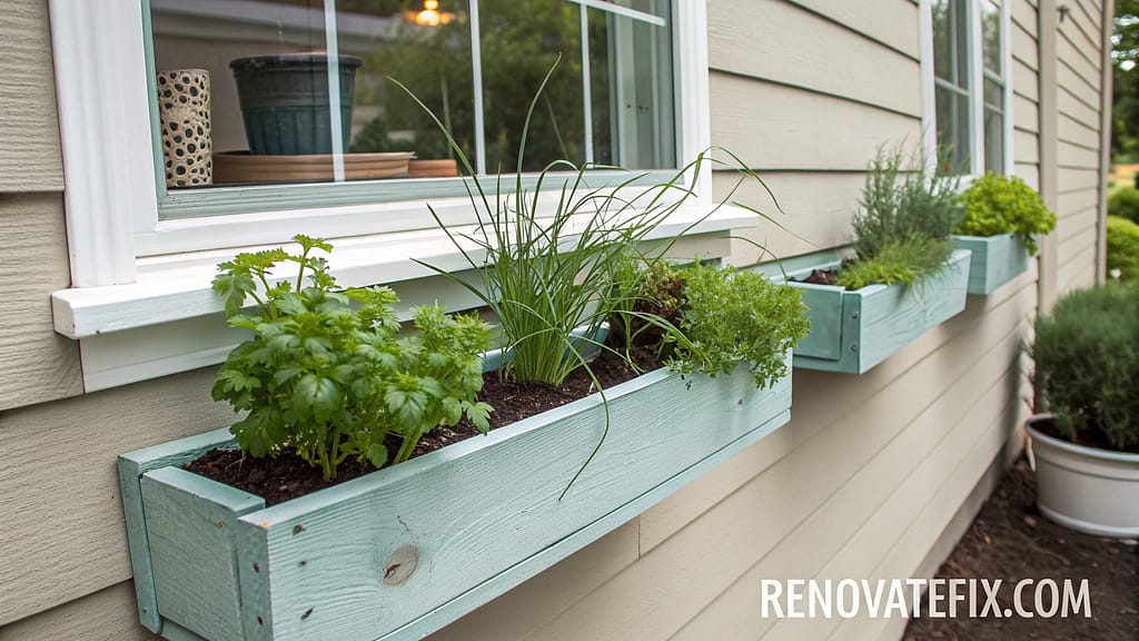 Mount affordable lumber boxes under windows or along porch railings, fill with quality potting mix, and plant culinary herbs for convenient kitchen access.