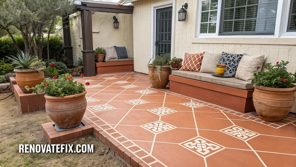 Refresh existing concrete surfaces with specialized outdoor paint rather than replacing entirely. Clean thoroughly, repair cracks, apply primer, and finish with concrete floor paint in solid color or stenciled pattern.