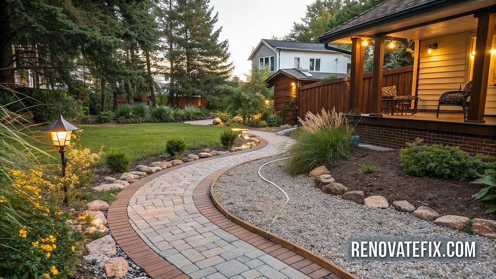 Edge paths with bricks, lumber pieces, or repurposed materials for defined borders. This solution costs significantly less than hardscaping alternatives while offering excellent drainage and low maintenance requirements.