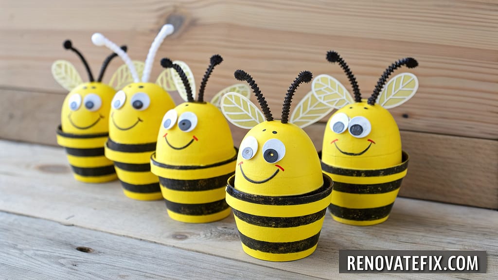 Cut individual cups from cardboard egg cartons, paint them vibrant yellow with black stripes, attach pipe cleaner antennae, and add small white paper wings for an instantly recognizable bee shape.