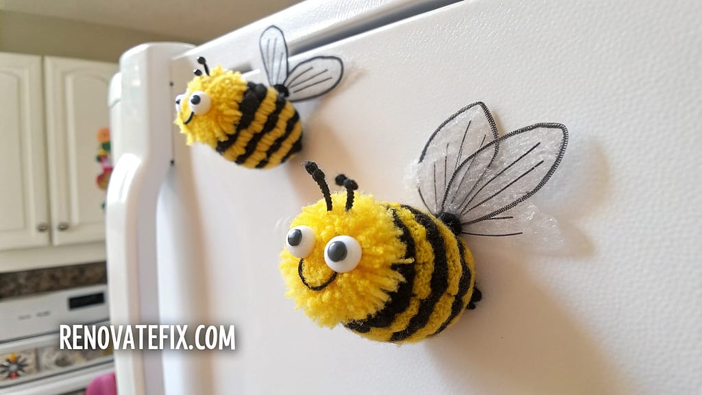 Fuzzy yellow and black pom-poms become charming fridge decorations when crafted into miniature bumble bees.