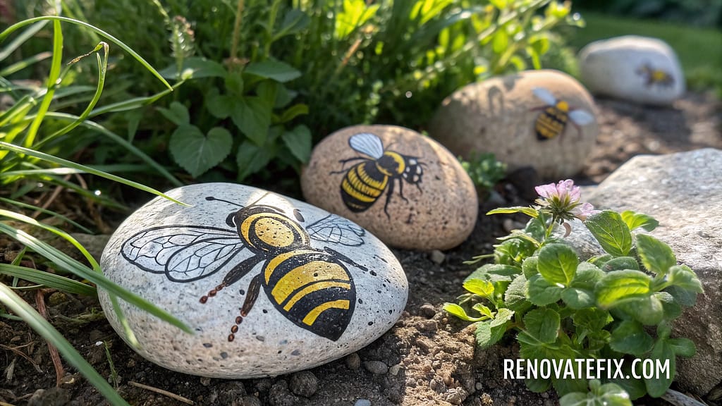 Select oval-shaped rocks, apply bright yellow paint with careful black stripes, add wing details using white or pale blue, finish with tiny antennae drawn with permanent marker or fashioned from wire.