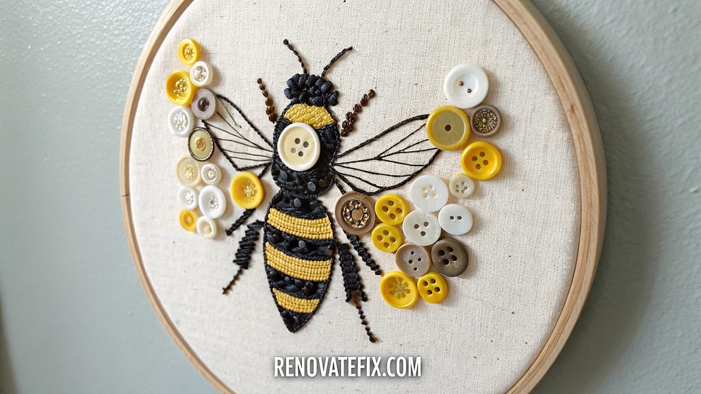 Mounted in embroidery hoops or frames, these textured artworks catch light beautifully while showcasing your button collection with pollinator-inspired creativity.
