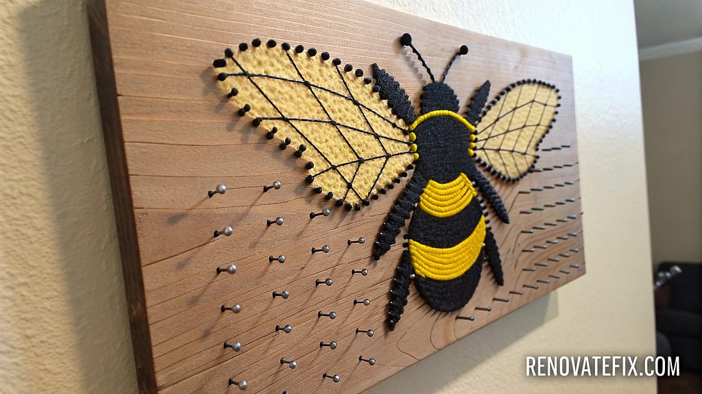 Stain wooden boards light honey color, hammer small nails following printed bee template outlines, wrap yellow and black embroidery floss in patterns between nails to fill shapes.