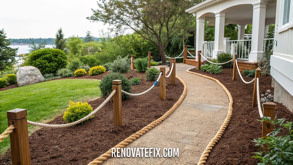 Outline walkway borders using thick nautical rope or affordable garden edging.