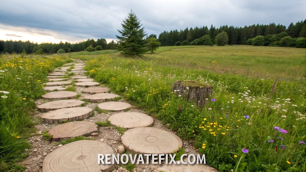 Cut into uniform sections, reinforce with weatherproof sealant, and arrange as circular stepping platforms.