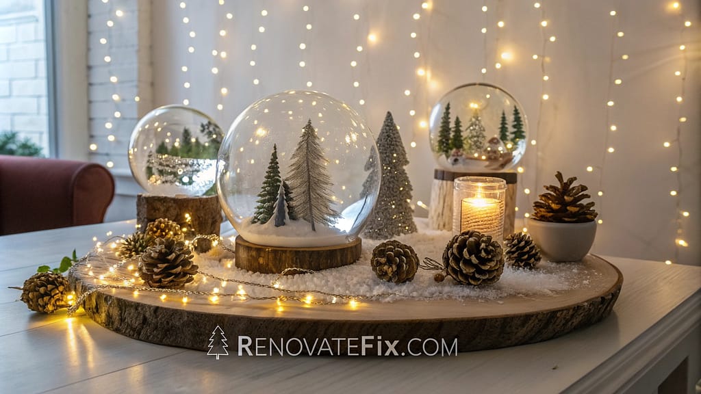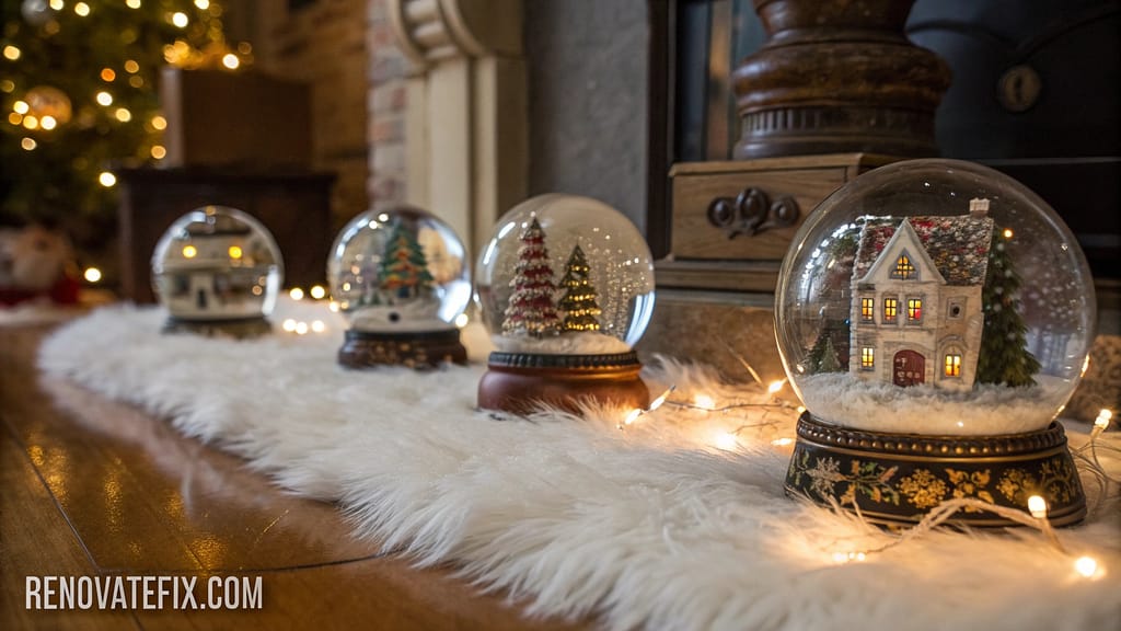Handpicked vintage-style snow globes featuring miniature winter scenes create whimsical centerpiece magic.