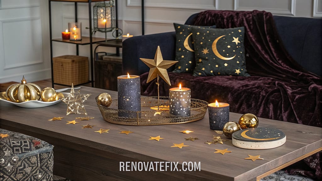 Metallic wire stars suspend slightly above surface, while twinkle lights create constellation effect.