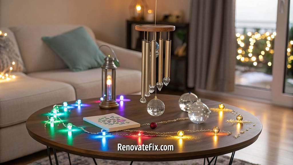 White glass wind chimes create musical winter garden. Crystal prisms catch light creating rainbow effects.