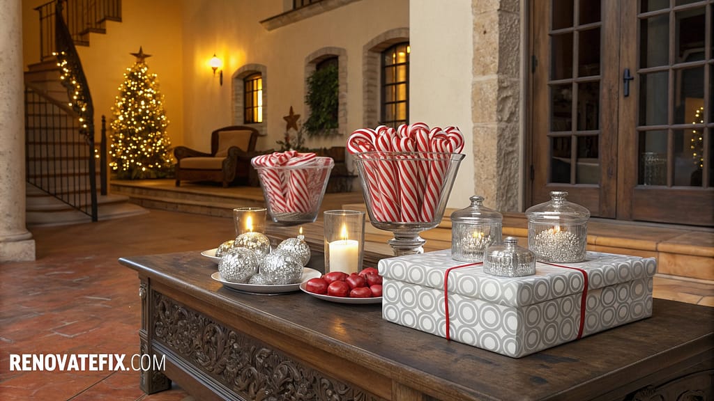 Peppermint-scented candles nestled between provide aromatic holiday charm.