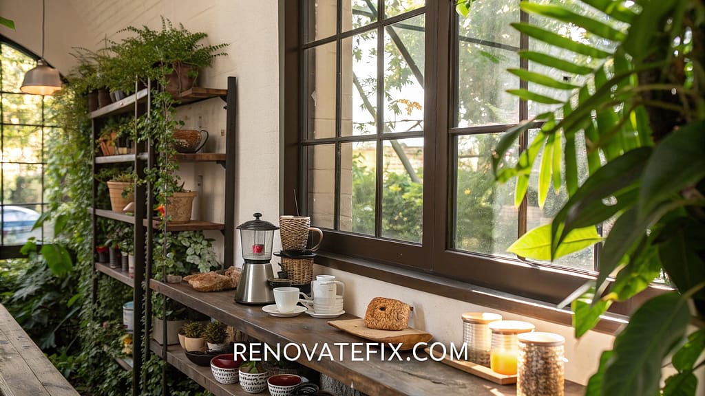 Plant-filled window ledge creates harmonious brewing environment amidst natural elements.