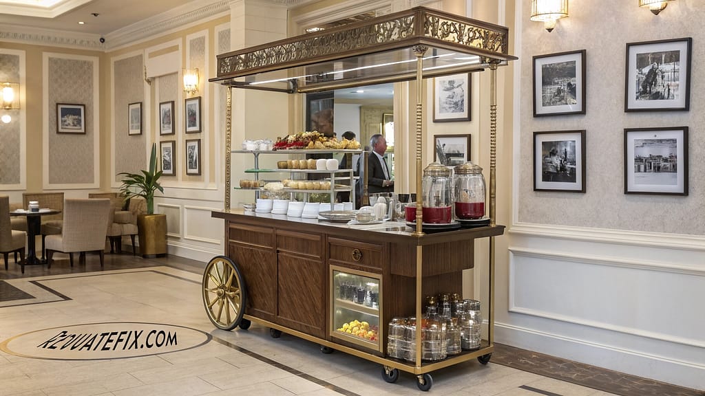 French-inspired serving cart offers mobile preparation space with refined elegance.