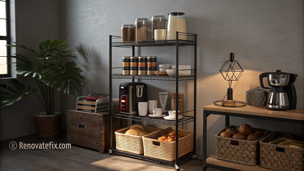 Wire shelving allows ventilation while basket storage maintains organization.