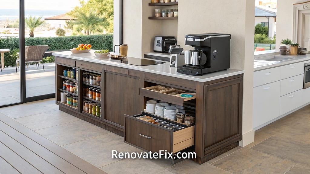 Angled shelving provides easy access while maintaining flow. Pull-out drawers offer abundant storage without compromising countertop real estate.