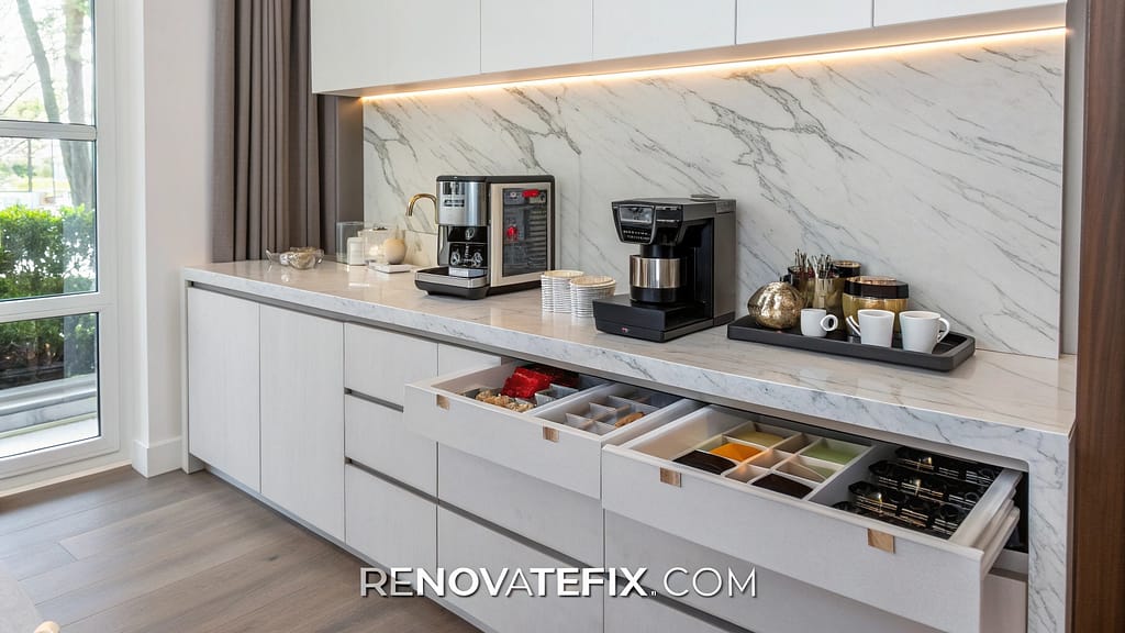 Remember, successful coffee stations balance practical needs with aesthetic preferences, creating an inviting spot that enhances your daily coffee experience.