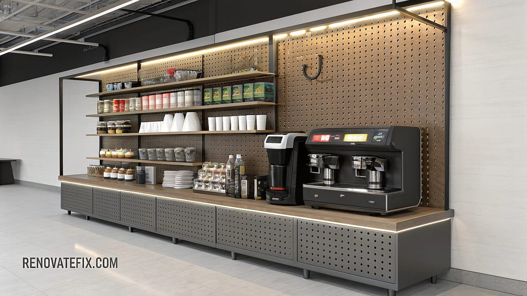 Custom-cut pegboard panels provide adaptable storage solutions while maintaining visual interest.