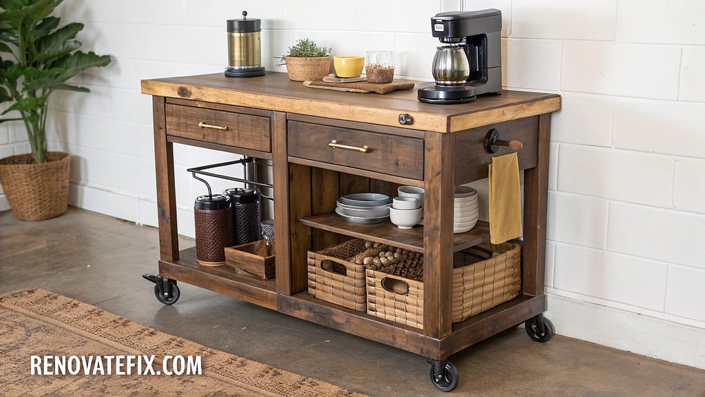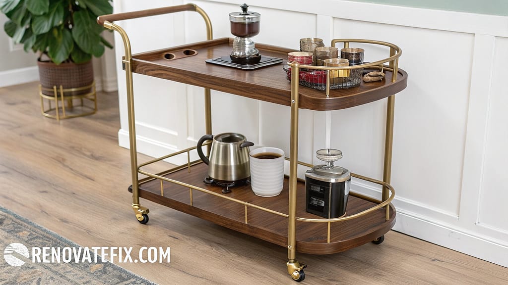 A handcrafted wooden bar cart radiates warmth through reclaimed timber shelving.